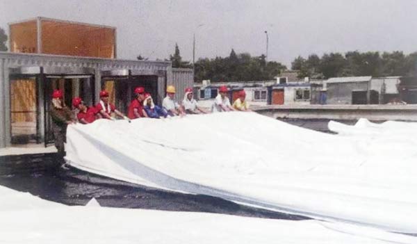 膜結構裁剪設計的內容與步驟如下:(1)在找形得到的空間膜面上布置裁剪線,將空間膜面劃分成若干個空間膜條;(2)將空間膜條展開為 平面膜片;(3)釋放預應力,對平面膜片進行應變補償(即考慮預應力釋放后膜材的彈性回縮);(4)根據以上結果,加上膜片接縫處及邊角處都放量,得到平 面裁剪片;給出膜材的下料圖及膜面的加工圖。